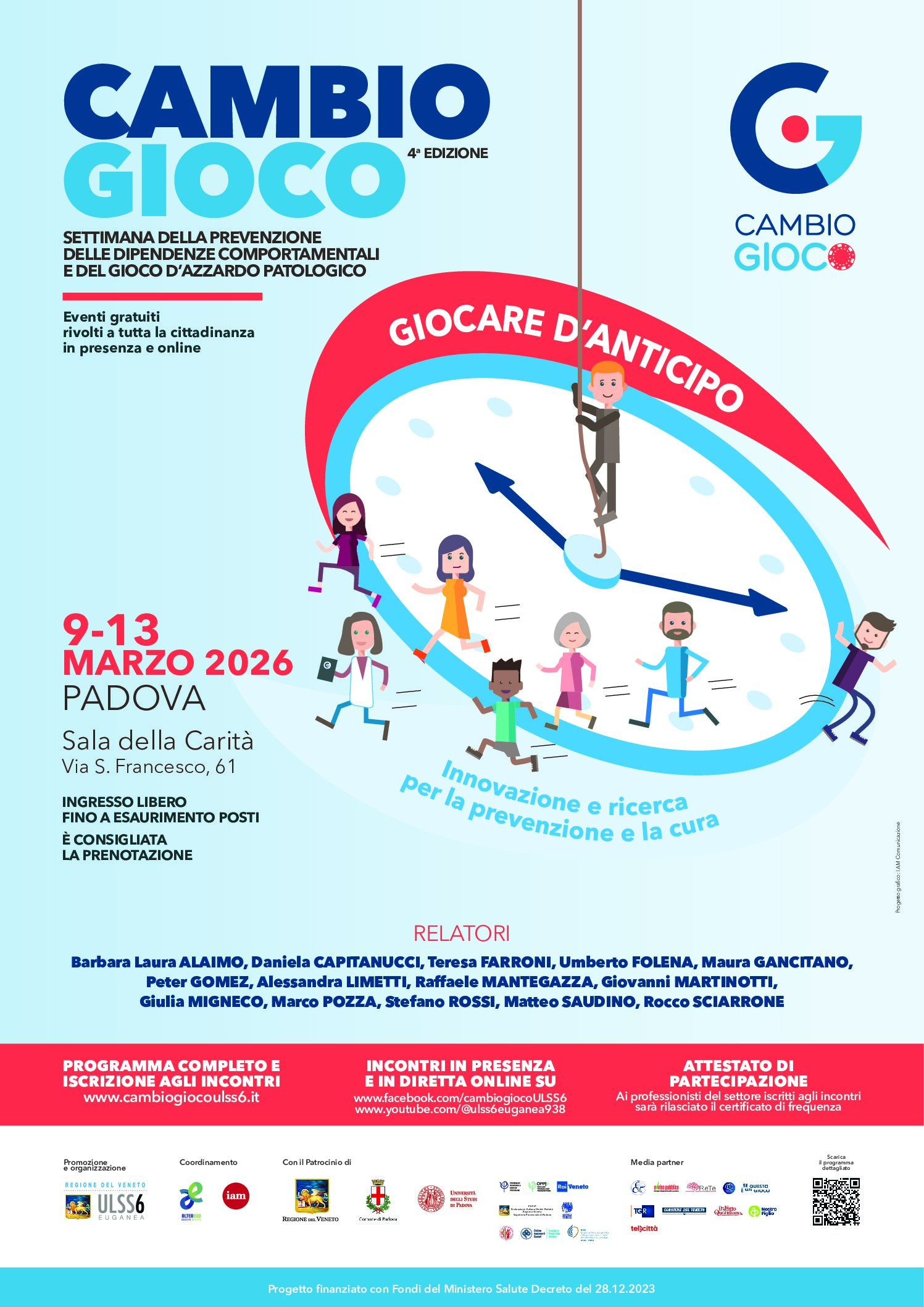 Dal 9 al 13 marzo 2026 presso la Sala della Carità, sita in Via S. Francesco, 61 Padova, si terranno degli eventi gratuiti rivolti a tutta la cittadinanza (in presenza e online), in occasione della settimana della prevenzione dalle dipendenze comportamentali e del gioco d'azzardo patologico.