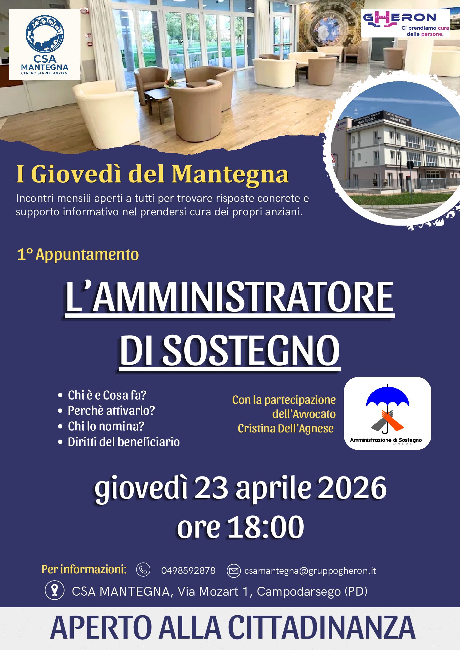 Il primo appuntamento verterà sul ruolo dell'amministratore di sostegno con la partecipazione speciale dell'Avv. Cristina Dell'Agnese.