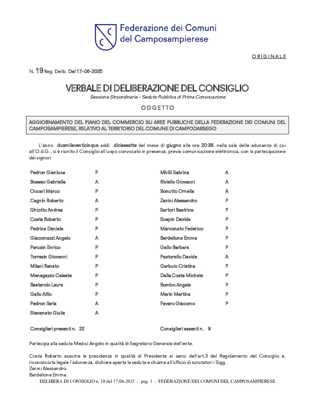 Delibera di Consiglio n.19 del 17-06-2025 della Federazione dei Comuni del Camposampierese